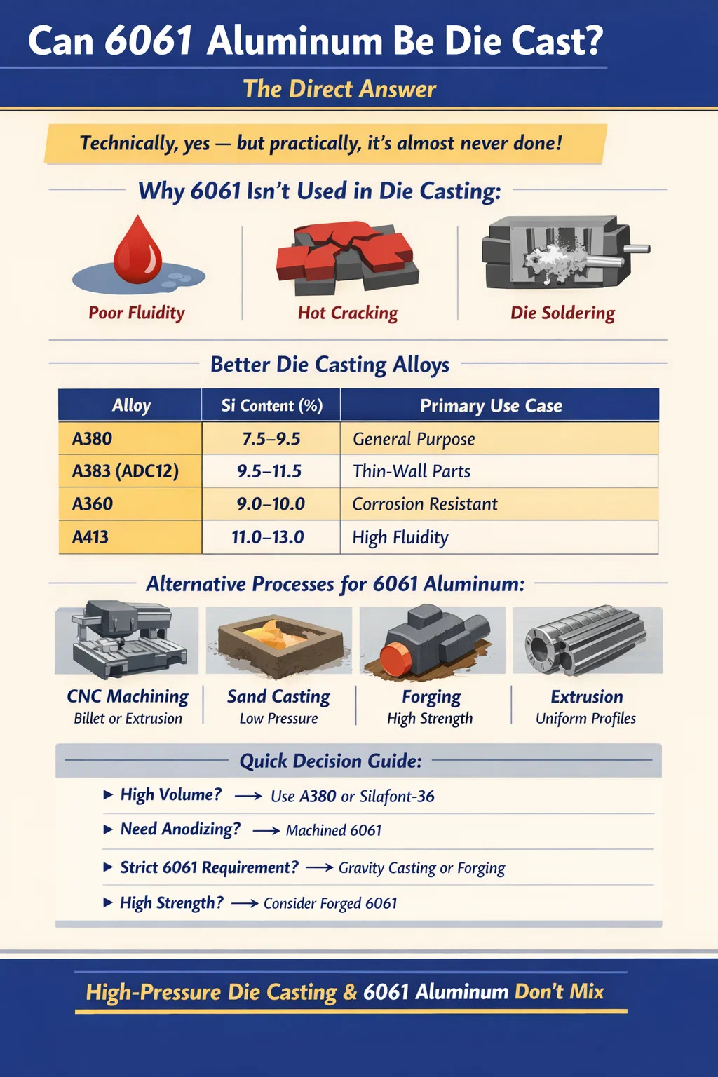 Go teicniúil, tá - ach i ndéantúsaíocht phraiticiúil, Ní úsáidtear 6061 alúmanam beagnach riamh i réitigh bás , agus comhairleoidh an chuid is mó d'áiseanna bás-réitigh ina choinne. Tagann an chúis síos go dtí ceimic cóimhiotail. Is cóimhiotal alúmanaim saoirsithe é 6061, rud a chiallaíonn gur innealtóireacht é go sonrach le haghaidh próisis amhail easbhrúite, rolladh agus brionnú - ní le haghaidh instealladh cruach bás faoi bhrú ard. Cé go bhfuil a ábhar maignéisiam agus sileacain sármhaith le haghaidh feidhmíochta struchtúrach tar éis cóireála teasa, cruthaíonn sé fadhbanna tromchúiseacha sa timpeallacht bás-réitigh: sreabhach lag, claonadh scoilteadh te, agus saincheisteanna sádrála bás a ardaíonn rátaí scrap agus costais uirlisí.