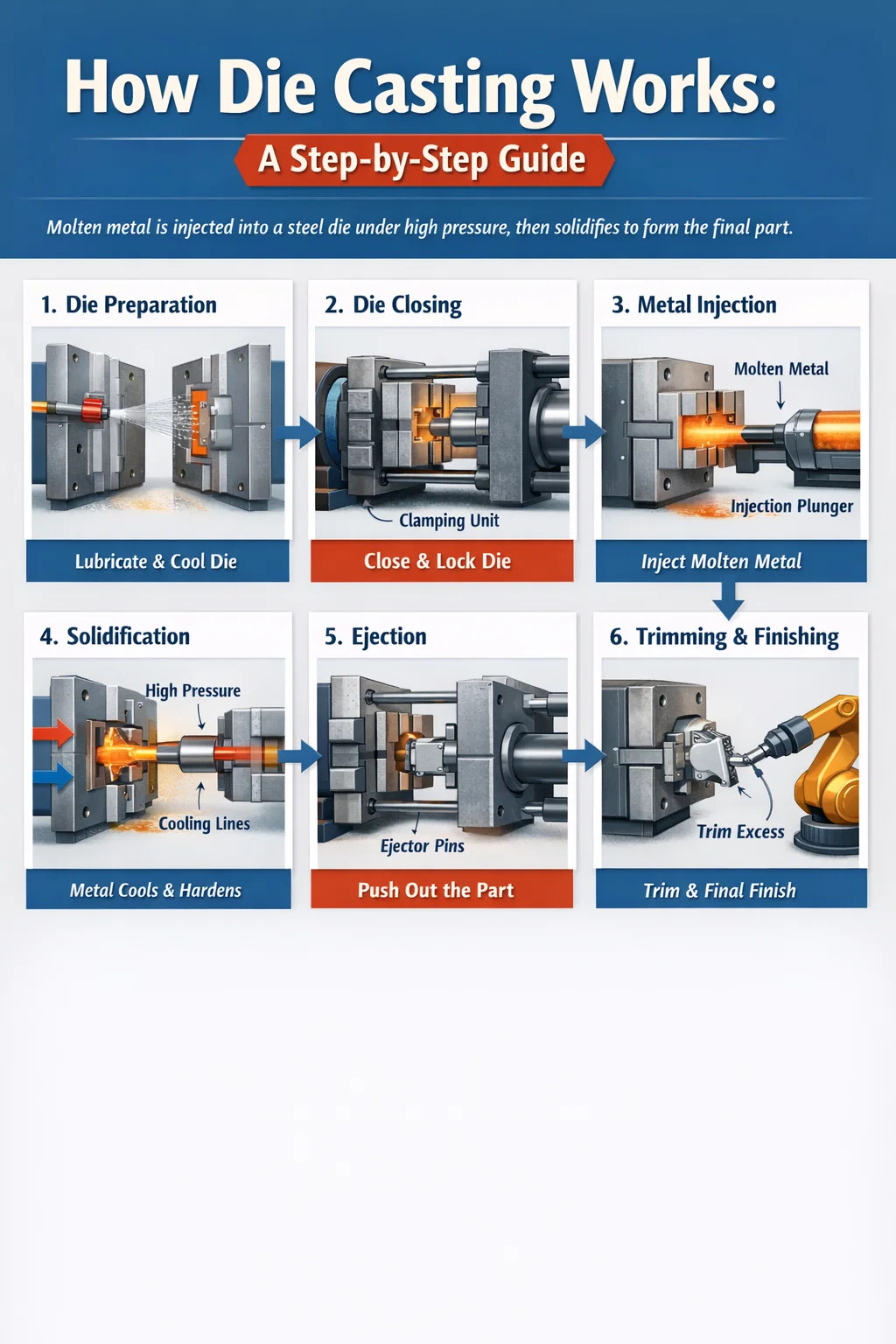 - Teocht bás: Caithfidh an dísle cothromaíocht theirmeach a bhaint amach agus a chothabháil — go hiondúil 300°F–500°F (150°C–260°C) d’alúmanam — sula rithfear páirteanna táirgthe. Déanann bás fuar lochtanna dromchla; leathnaíonn bás róthéite am timthriall agus luasghéaraíonn sé tuirse teirmeach.
