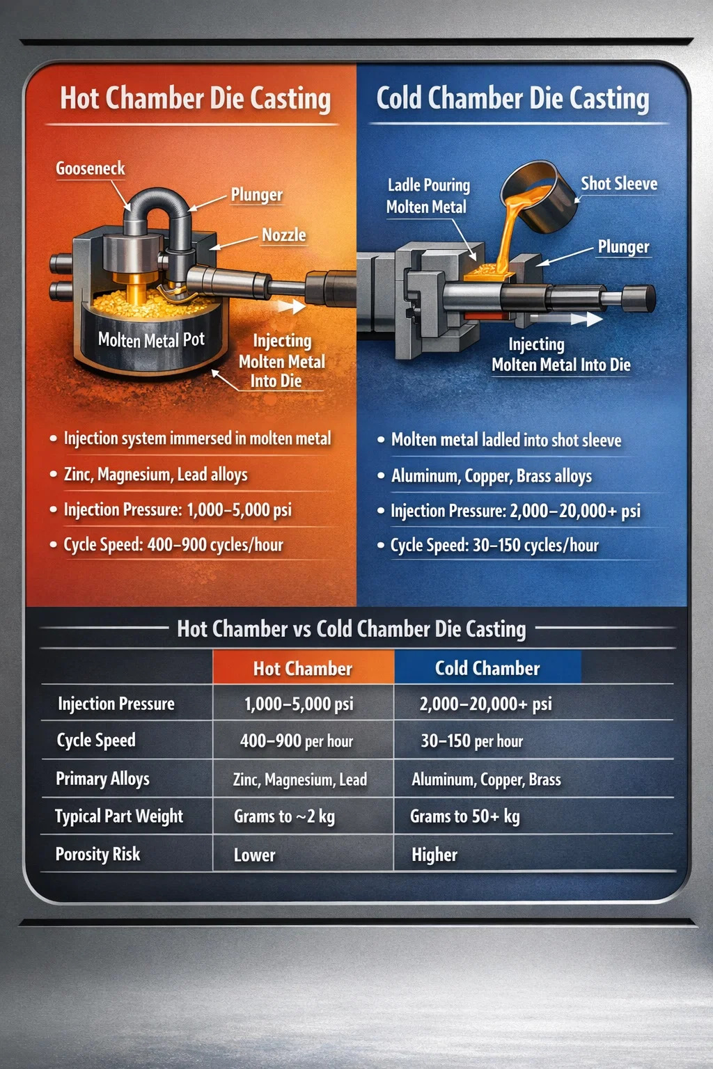 Is iad an dá mhodh bunúsacha a bhaineann le bás-réitigh réitigh bás seomra te agus réitigh bás seomra fuar . Tá an sprioc bhunúsach chéanna ag an dá phróiseas seo - miotail leáite a bhrú isteach i dísle cruach chruaite faoi ardbhrú chun páirteanna beachta in-athdhéanta a tháirgeadh - ach tá difríocht shuntasach eatarthu maidir leis an gcaoi a ndéantar an miotail a leá, a láimhseáil agus a instealladh. Má roghnaítear an modh mícheart do do chóimhiotal nó do chuid céimseata, d'fhéadfadh droch-líonadh, porosity iomarcach, caitheamh bás roimh am, agus rátaí costasacha fuíll a bheith mar thoradh air. Is é tuiscint a fháil ar cad a scarann an dá mhodh seo an pointe tosaigh d’aon chinneadh tromchúiseach dísleáite.