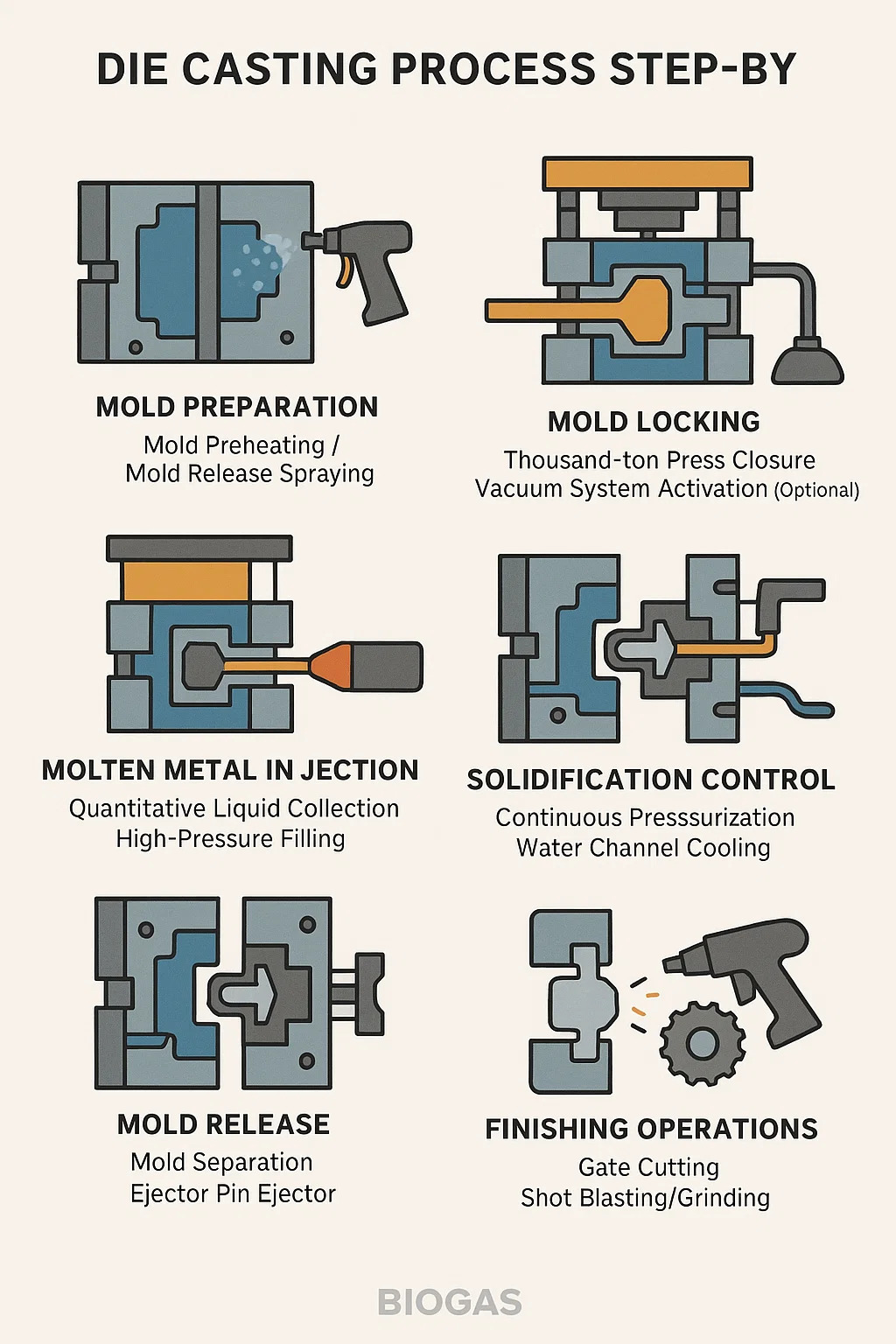 Líon ardbhrú: Cuireann plunger alúmanam leáite isteach sa chuas múnla ag luas gunna (30-100 m/s), ag líonadh an chuas laistigh de 0.01-0.3 soicind.