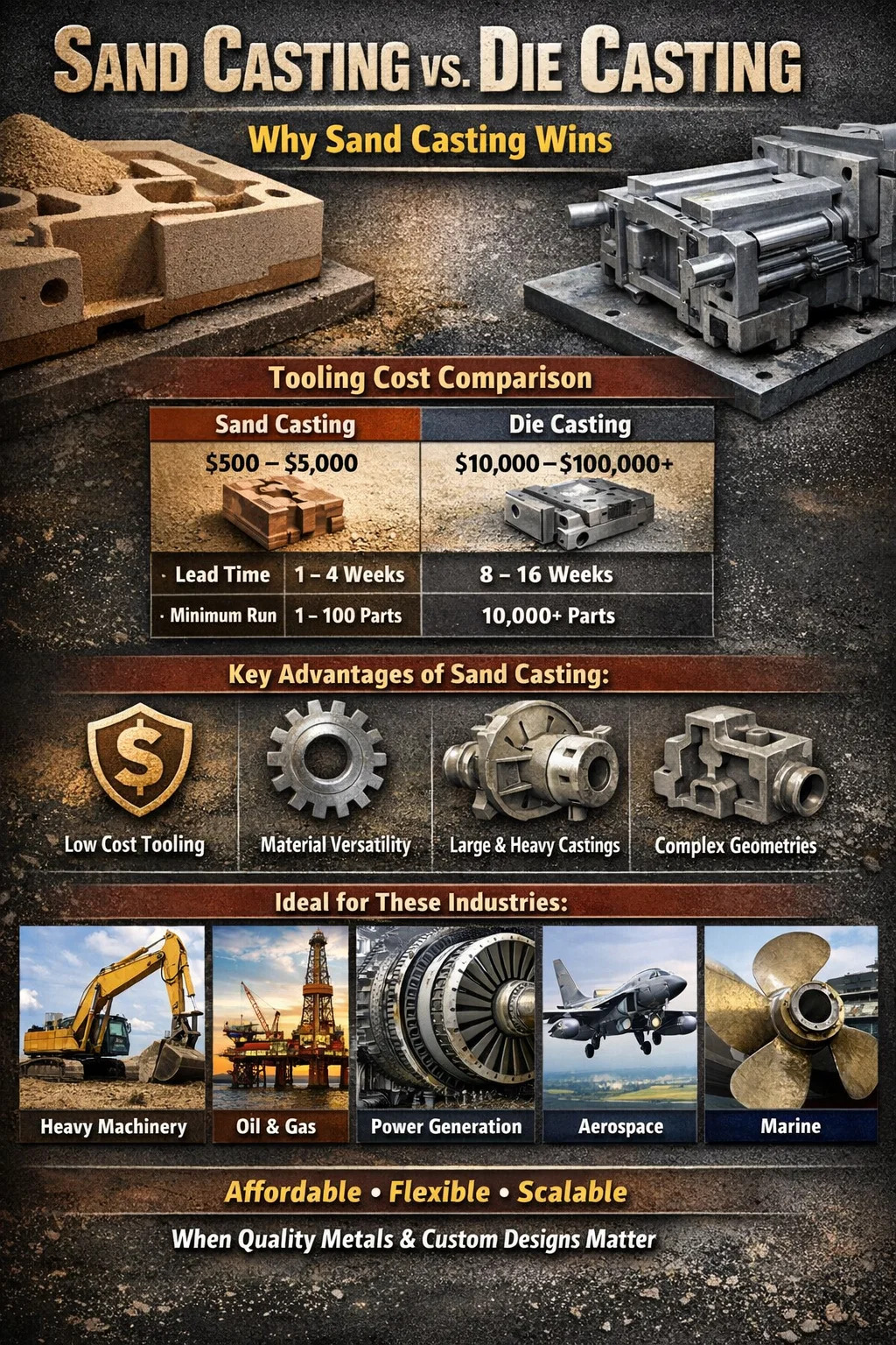 Tuilleann bás-réitigh a áit i ndéantúsaíocht ard-toirte tomhaltóirí agus feithicleach nuair is gá páirteanna alúmanaim agus since a tháirgeadh ar luas, le bailchríoch dromchla den scoth, ag an gcostas is ísle in aghaidh an aonaid. Ach clúdaíonn réitigh gaineamh raon i bhfad níos leithne de riachtanais innealtóireachta, láimhseálann sé raon níos leithne ábhar, scálaí ó fhréamhshamhlacha aonair go dtí na mílte páirteanna, agus tá sé fós éifeachtach ó thaobh costais ar fud cásanna nach n-oibríonn eacnamaíocht bás-réitigh. Maidir le haon innealtóir nó gairmí soláthair a dhéanann measúnú ar roghanna próisis réitigh, ba cheart go mbeadh an réitigh gaineamh mar thúsphointe - agus ba cheart go mbeadh an t-ualach fírinnithe ar aistriú uaidh, ní ar é a roghnú.